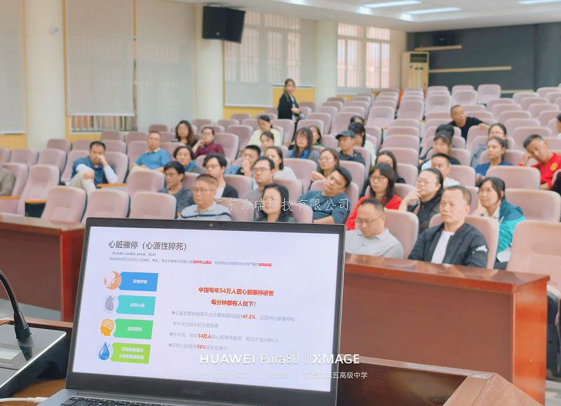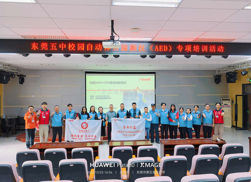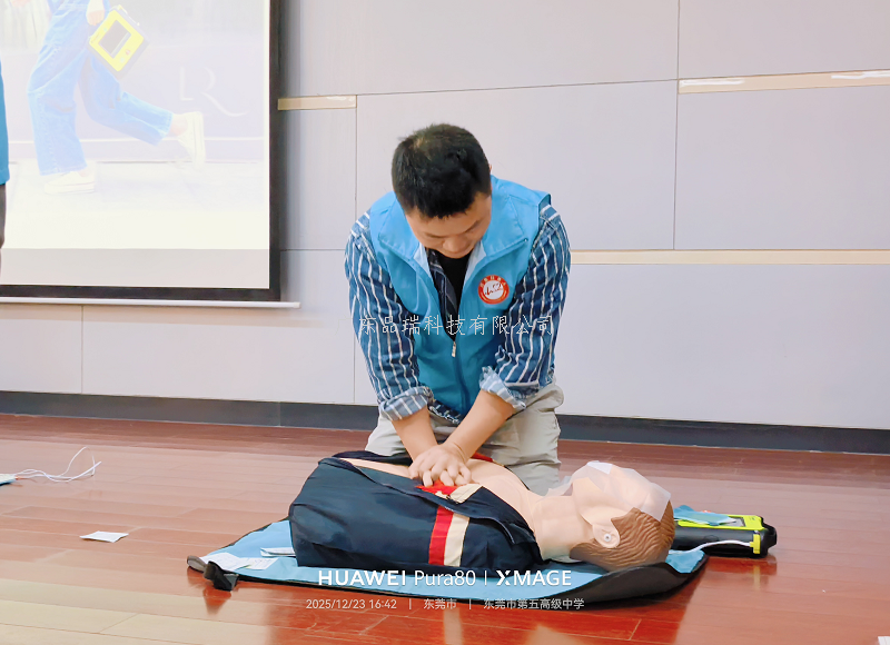 2025年12月23日,东莞市第五高级中学邀请广东品瑞科技参与学校应急救护培训与交流。品瑞科技派出专业辅导老师全程授课,此次培训涵盖“急救生命链流程、止血包扎、海姆立克急救法、心肺复苏(CPR)及AED除颤仪使用”等核心技能。