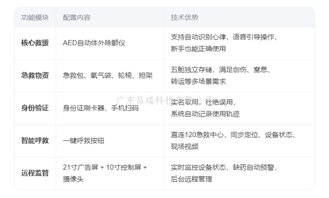 品瑞智能急救站不仅提供AED,更整合担架、氧气袋、急救包、轮椅,并可实现“从发现到转运”全流程急救支持,填补院前急救不足。