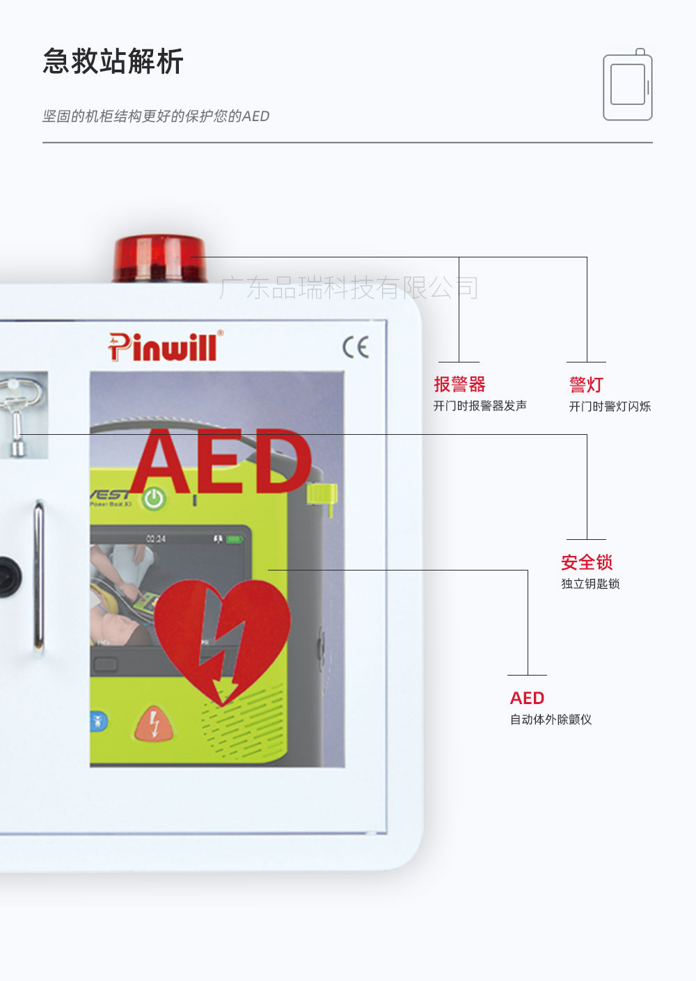 品瑞PRJJZ-02 壁挂式急救站,是一款AED应急救护一体机。结合AED除颤仪的应用,打造社区、校园、商超、企业、园区、体育等公共场所一站式急救服务,通过数据互联,实时掌握最新应急动态,实现数据管理更轻松。