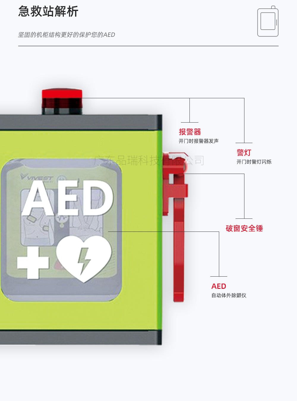 小型号急救站 品瑞PRJJZ-03 AED急救 防水防尘,声光报警。AED自动体外除颤器结合体,支持联网,AED地图,定位等功能。适用于公共场所、校园、企业、体育馆、健身房、商超、社区等场所。